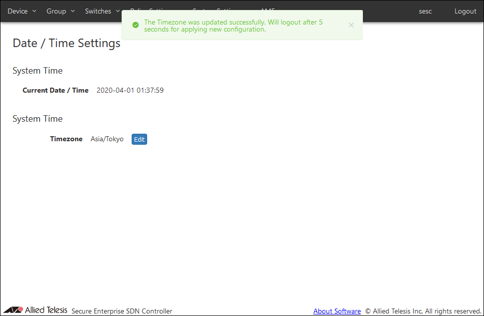 AMF Security mini gets and uses the system time of your AlliedWare Plus device, but it does not get the time zone setting. Therefore, for example, to use Japan time (JST: 9 hours ahead of Coordinated Universal Time (UTC)), set according to the following procedure:NoteIf you change the time zone setting, AMF Security mini restarts and the setting is retained.