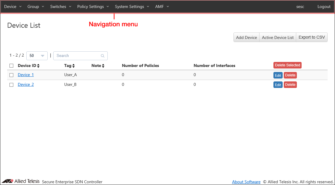 | Switches > Active AMF Member List | Name | × | − | × | |