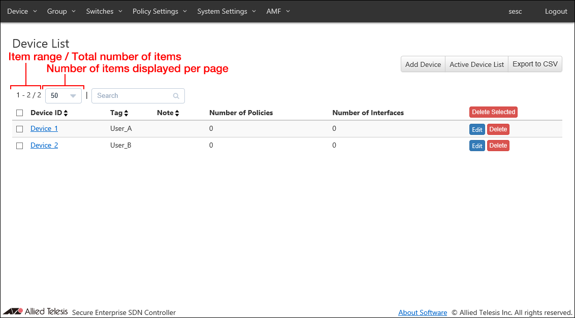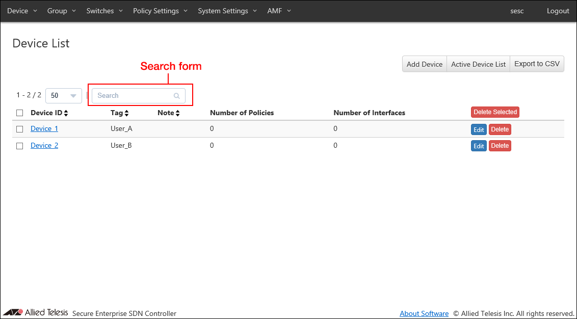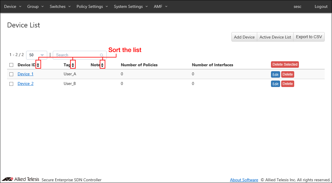 The following pages have controls to search, filter or sort items in tables.- Device > Device List