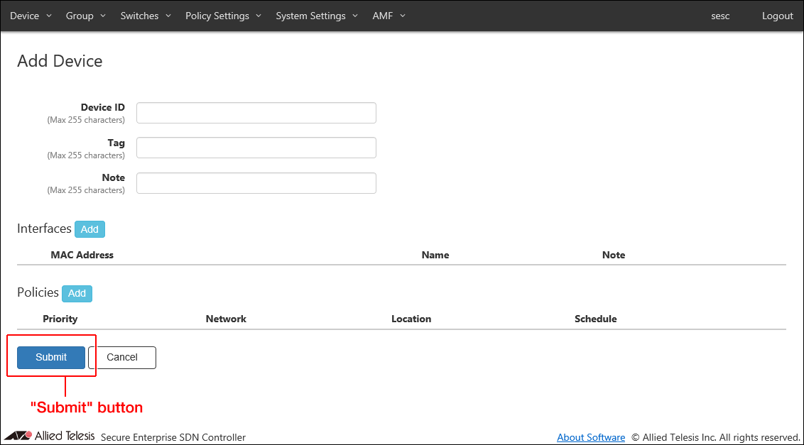 Each setting page has the "Submit" button. After entering the settings on each setting page, be sure to click the "Submit" button before moving the page.When you click the "Submit" button, the changes you made on the page are immediately applied to the AMF Security mini's operation.