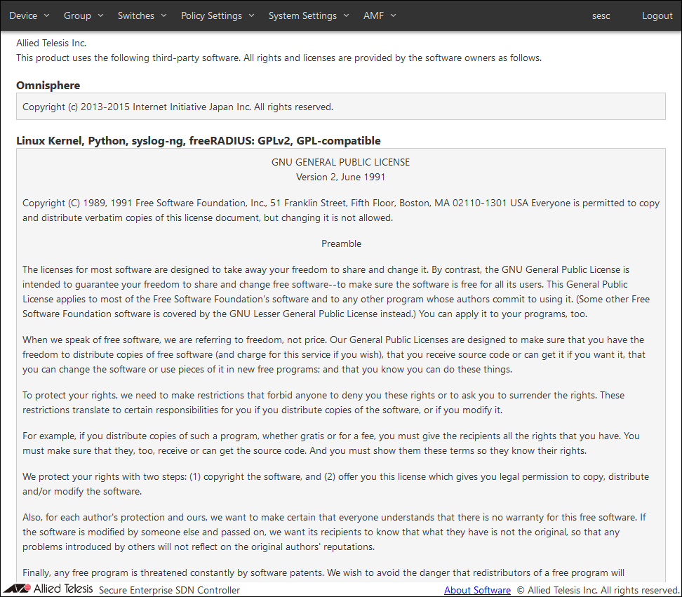 You can view the list of names and licenses of the software used by AMF Security mini.