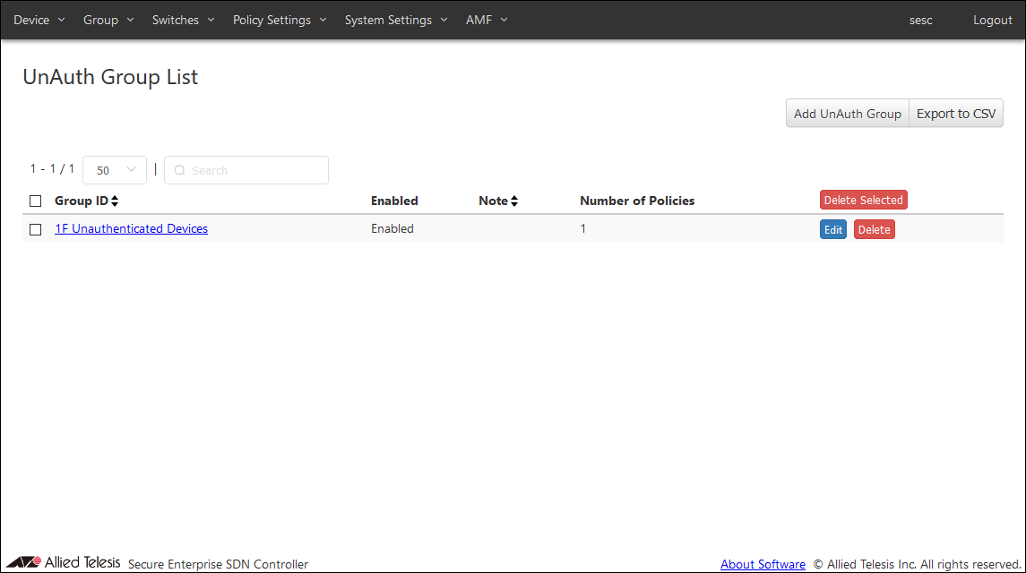 This page shows a list of UnAuth Groups registered in AMF Security mini's database.