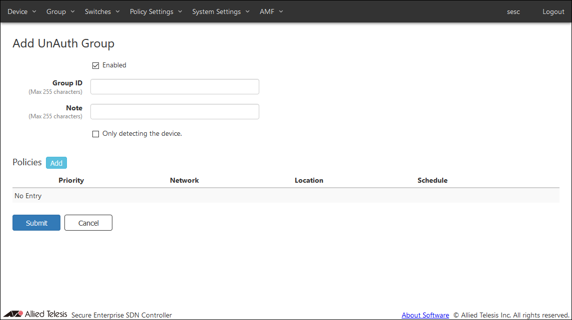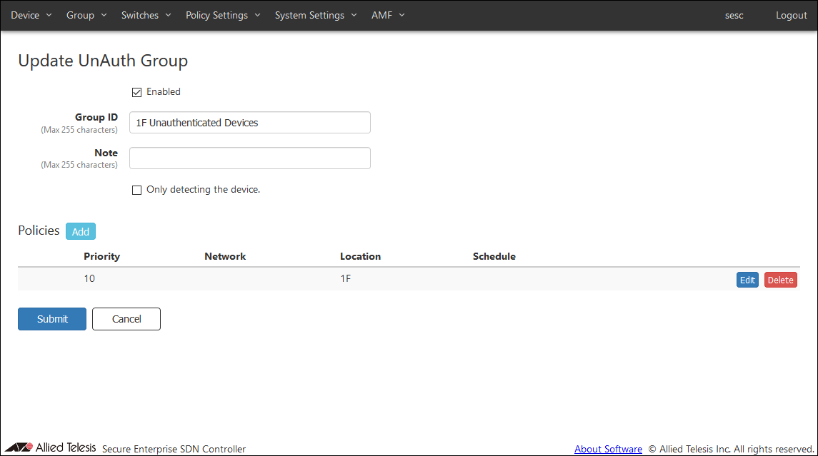 - If you specify a Location, UnAuth Group can access the network only from AMF Members in the Location. If no Location is selected, it is accessible to all AMF Members.