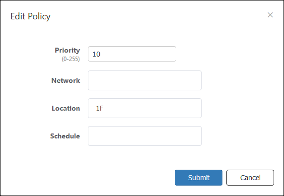 | Schedule | Specify a schedule when the unauthenticated device can be connected to the network so that it is categorized in the group. Maximum 100 IDs of the existing schedules are shown in the drop-down list. If you enter text in the field, Schedule IDs in the drop-down list are dynamically filtered to the ones which contain the input text in Schedule ID or Note (it shows maximum 100 elements). From the drop-down list, select a Schedule ID. If you specify a Schedule, the group can access the network only when the schedule is effective. If you do not specify a schedule, a device can always access the network. You have to add the schedule before specifying it for a group. Refer to Policy Settings > Add Schedule for the instruction on how to register a schedule. |