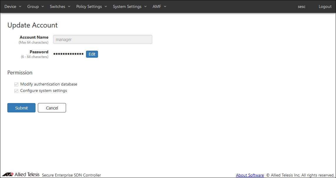 NoteWhen you forget all the passwords for user accounts with "Configure system settings AMF Security mini must be initialized if you forget Password for all Accounts that have the "Configure system settings" check box, including the default "manager". Please make sure that you keep your passwords safely and never forget them.