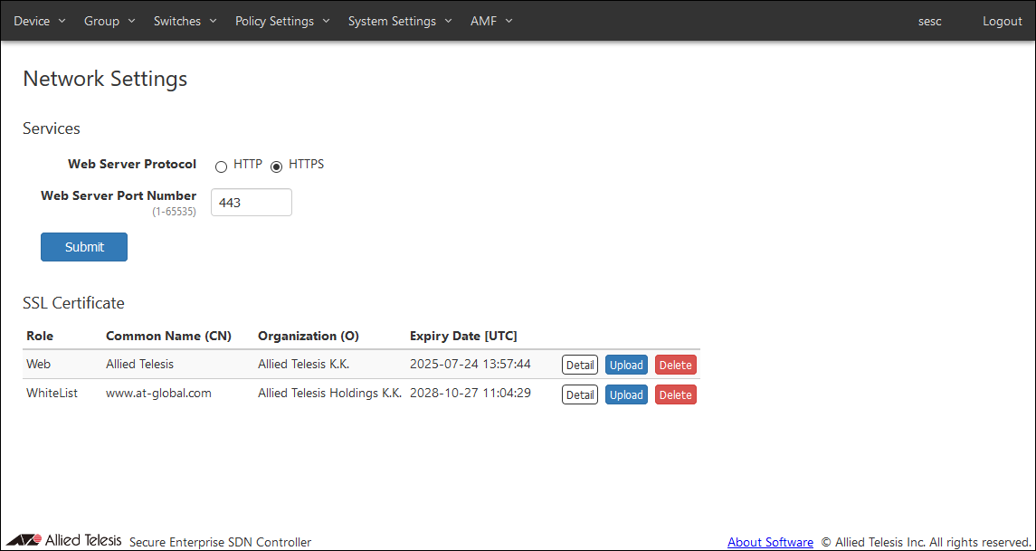 | Delete | Delete the installed SSL server certificate and restore the default certificate which is self-signed by AMF Security mini. |