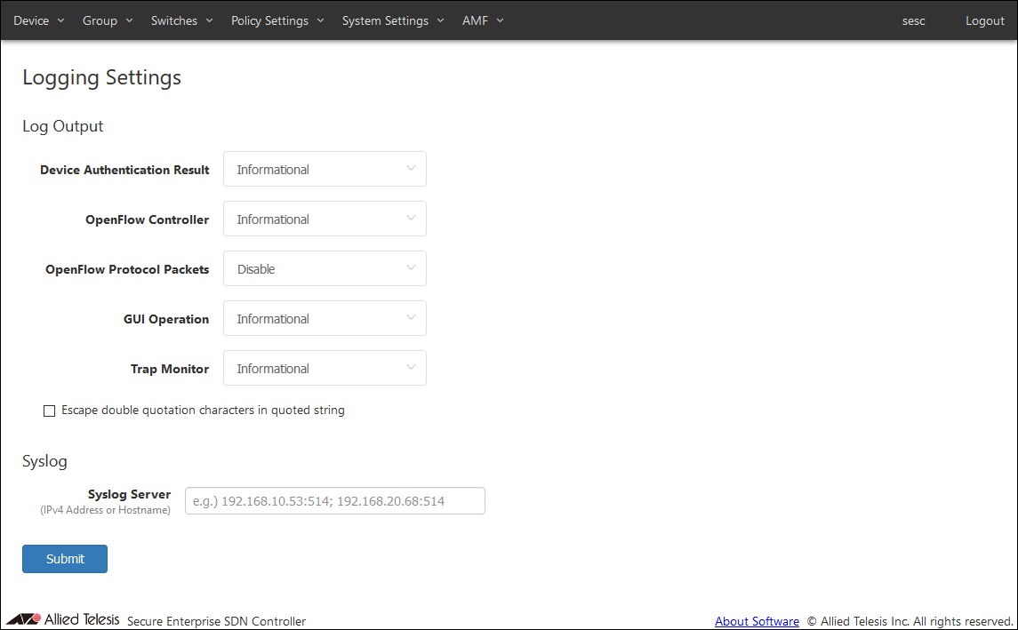 | Device Authentication Result | Minimum level for device authentication logs to be output. Default is Informational. |