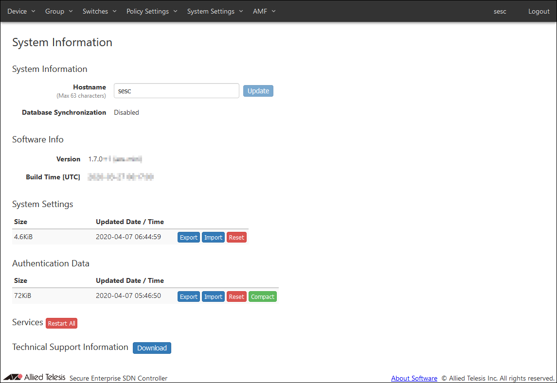 | Build Time [UTC] | Build date and time of the installed AMF Security mini software. |