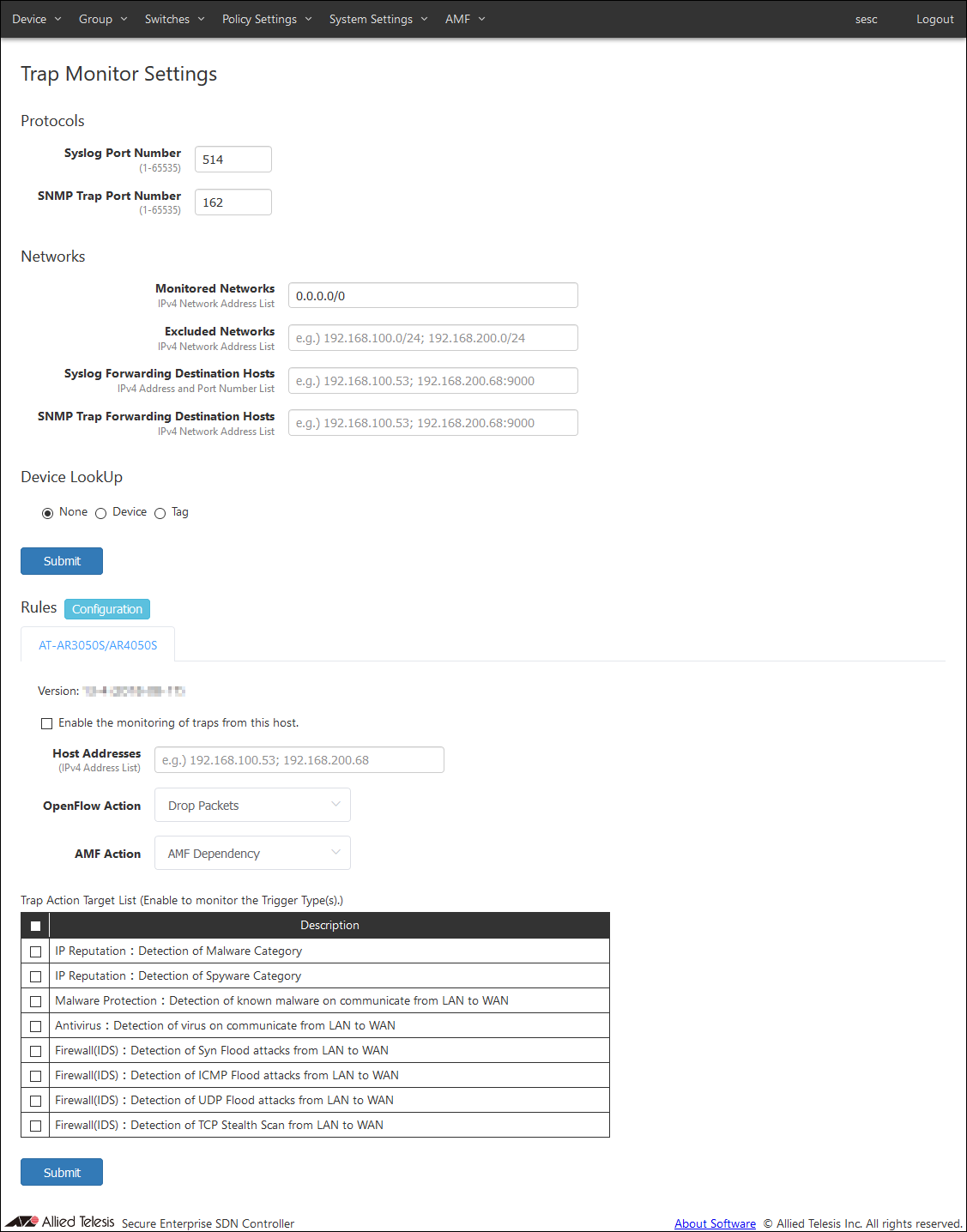 Item Name Description Enable the monitoring of traps from this host. If you want to monitor the device by receiving Syslog message from AT-AR3050S or AT-AR4050S, check the check box. Host Addresses IPv4 address of AT-AR3050S/AT-AR4050S routers. Multiple hosts can be specified by separating each address by a semicolon (;). Default is unspecified (empty) which means that AMF Security mini accepts syslog messages from any IPv4 address. OpenFlow Action Not supported in this version. AMF Action An action to be taken on the AMF network deploying the AMF Application Proxy feature. - Drop Packets: Block traffic from the device at the layer two (MAC) level.