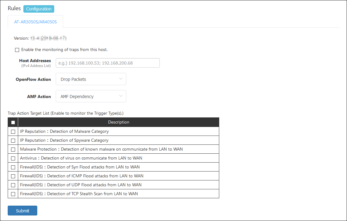 Item Name Description Page Bottom Submit Save the input Rules configurations. - IP Reputation:Detection of Malware Category