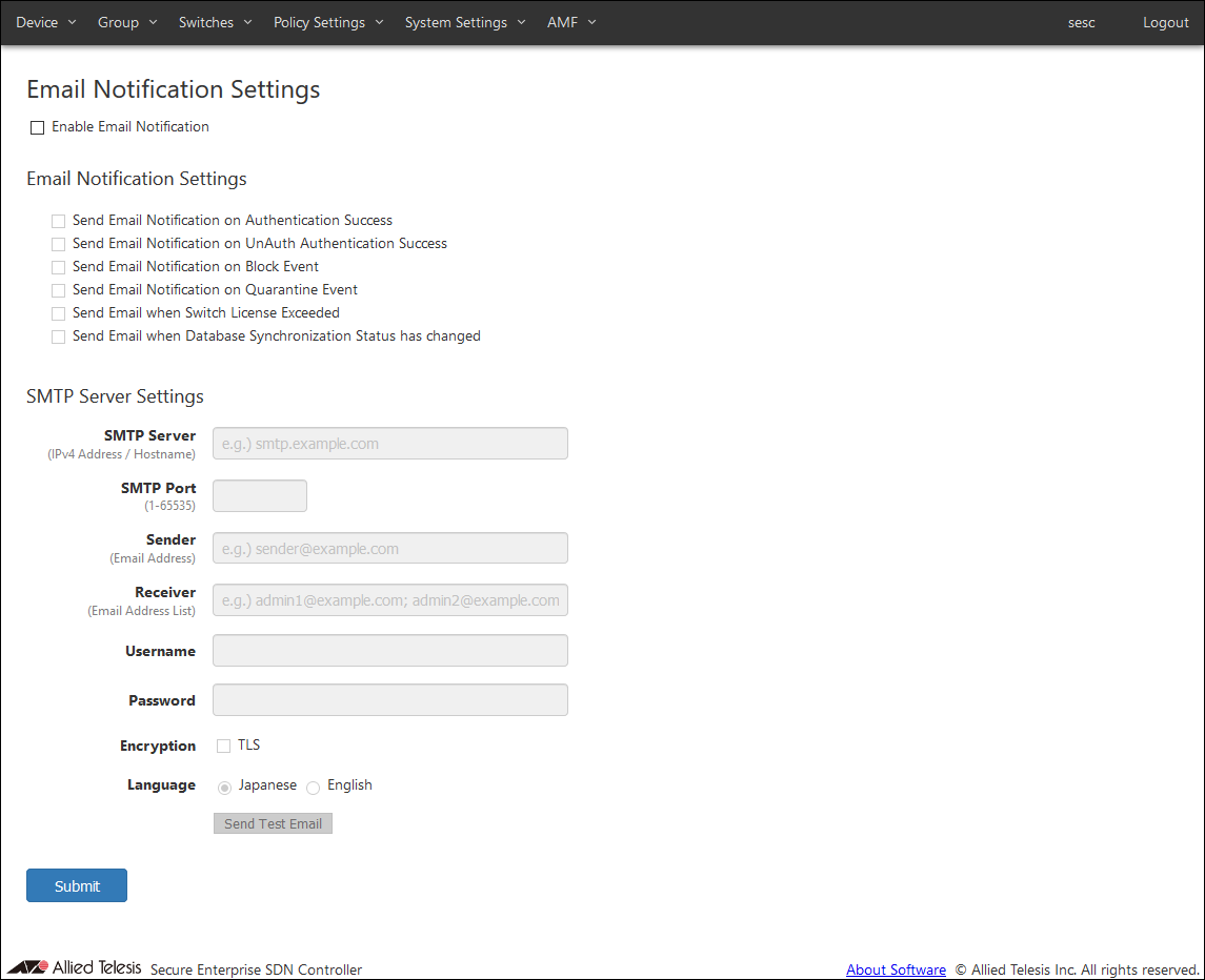 This page lets you configure Email Notifications.You can configure AMF Security mini to notify an administrator with an email when an event such as device authentication or block happens.