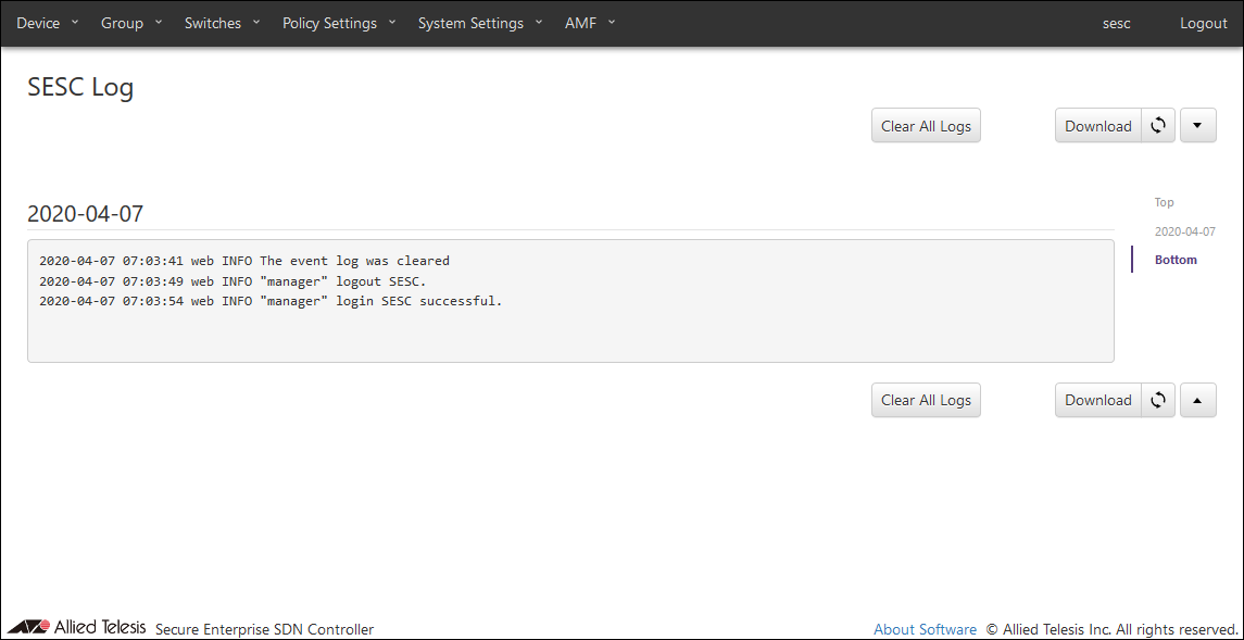 This page shows log messages generated by AMF Security mini service. The latest 1000 messages are displayed in this page.You can view messages for a specific date by selecting a date at the right side of the page.