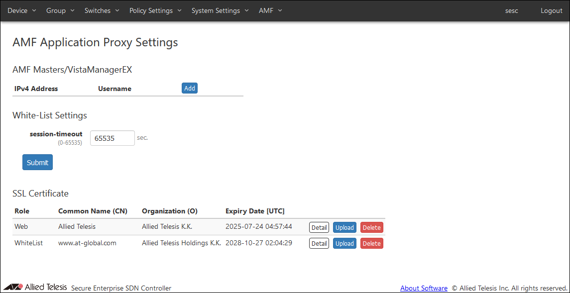 If you want to encrypt the control session with the AMF Application Proxy Whitelist, obtain the SSL server certificate from a trusted certificate authority and upload it to AMF Security mini.