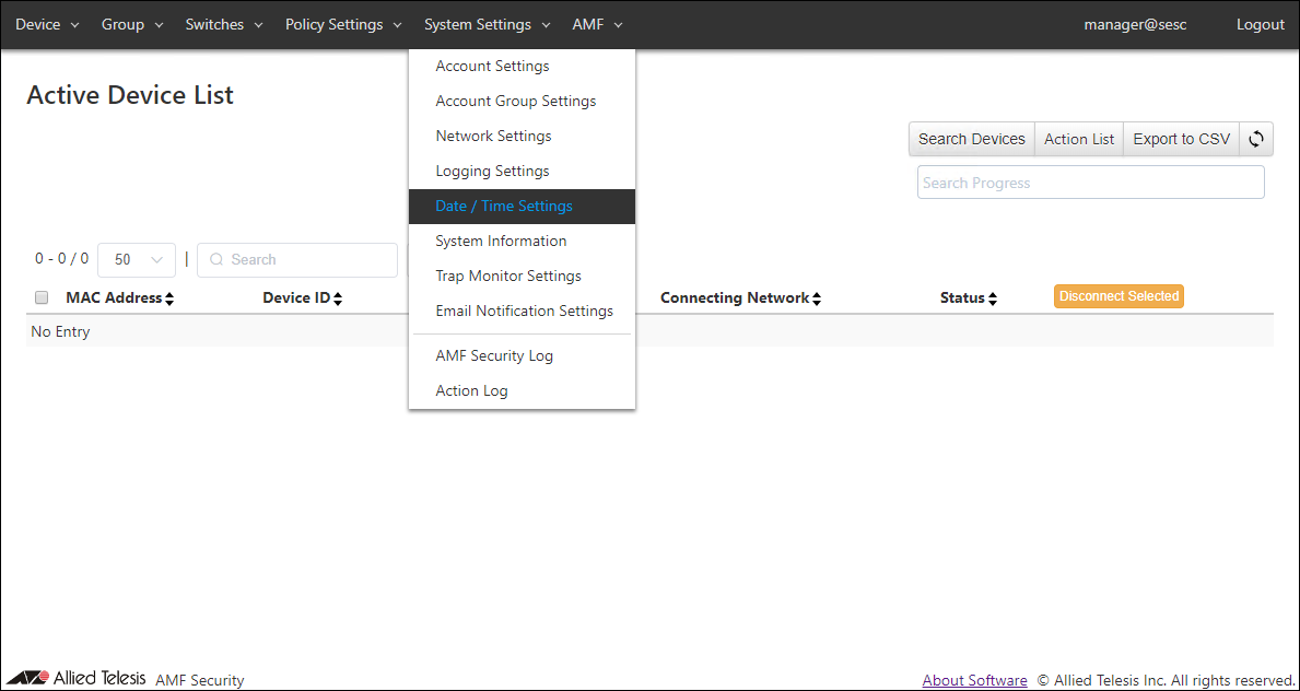 If you have a SSL server certificate issued by a trusted certification authority (CA), you can install the certificate on the Network Settings > System Information page's or the AMF > AMF Application Proxy Settings page's "SSL Certificate" section after logging in to the AMF Security mini. - After logging in, the Device > Active Device List page is displayed.