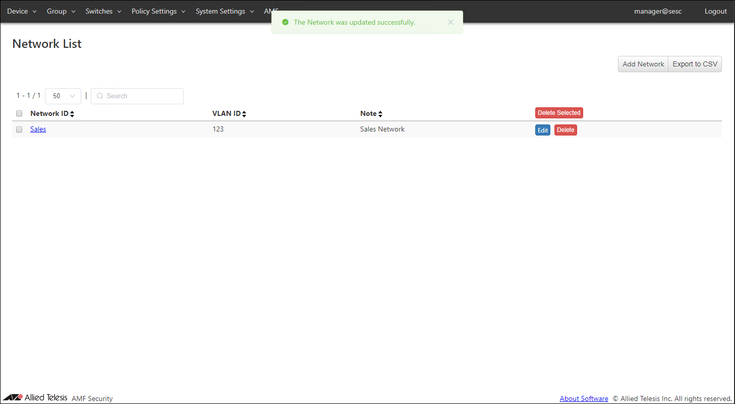 Later you can use the network to specify which VLAN a device can belong to. AMF Security achieves this by telling switches to add appropriate VLAN tags to the packet originating from the allowed devices.
