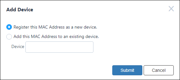 | Device ID | Submit | (Only displayed when the MAC address is unregistered) Open the Add Device dialog to add the MAC address as a new device or an additional interface of an existing device. You can select whether to add the address as a new device or to associate it with an existing device on the Add Device dialog. |