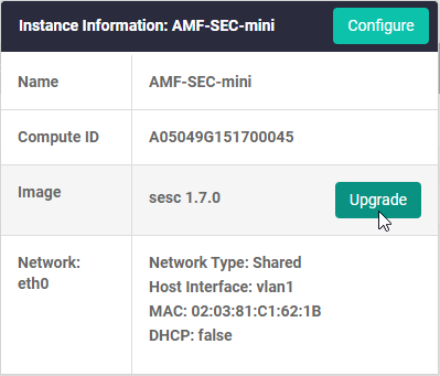 Setting Value Initial Value Image version Select the image transferred to the flash memory of this product in step 2 Unselected Storage size (MB) 512 Unspecified Advanced Settings Memory Limit (MB) 768 Unspecified CPU core limit (core index) 1 Unspecified Network Settings Add network Click to add a network and set the following items accordingly Interface type Shared Shared Host interface Choose the right interface Configuration dependent Use DHCP Unchecked Unchecked IPv4 Address Specify the appropriate IPv4 address/subnet mask length Not set Gateway address Specify the appropriate IPv4 address Not set Add DNS server Required if you want to specify a syslog server by host name on the AMF Security mini side DNS server Enter the IP address of the DNS server Unspecified