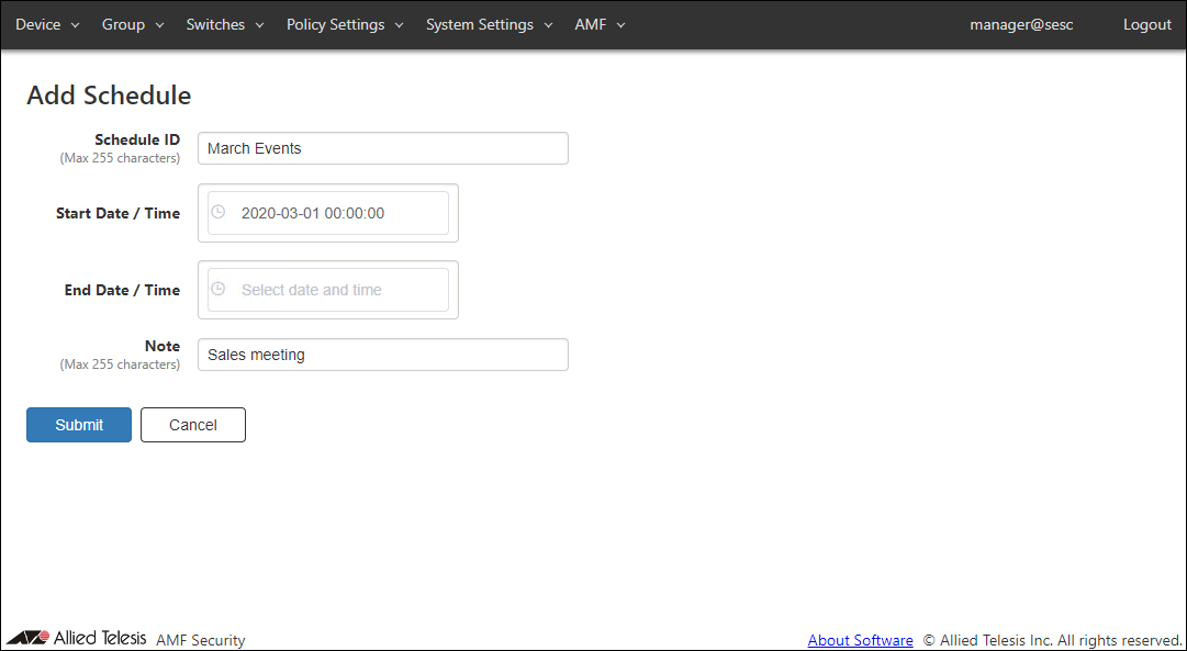 By adding schedules, you can control when a device can connect to the network. If one of the Starting or End Date / Time is not specified in a schedule, AMF Security mini treats it as if it has no time limitation.