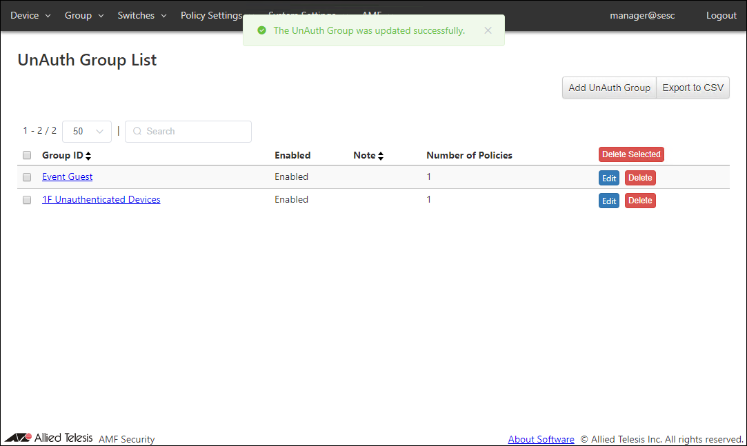 With those settings, unknown devices which are connected to one of the AMF Member in the location "1F" are detected as members of the UnAuth Group "1F Unauthenticated Devices".