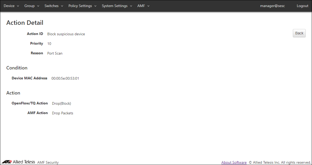 NoteTo unblock an AMF Security mini reported suspected device in an AMF Application Proxy environment, use this page to delete a corresponding action. Refer to Quick Tour's What is AMF Security mini > What is the AMF Application Proxy for more details on the AMF Application Proxy.
