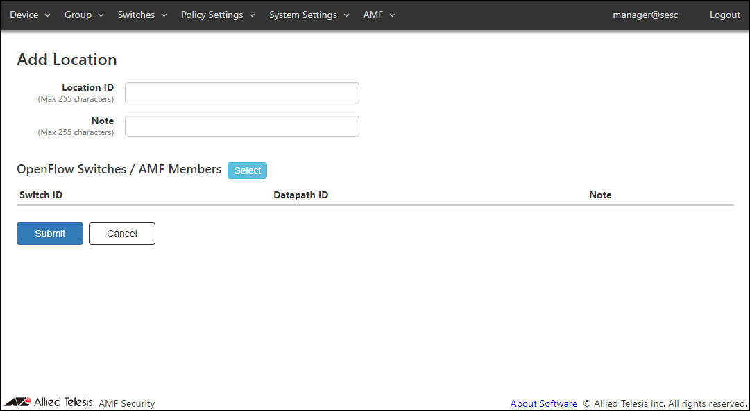A location consists of a Location ID (its name) and a list of OpenFlow Switches or AMF Members which are installed in the location.