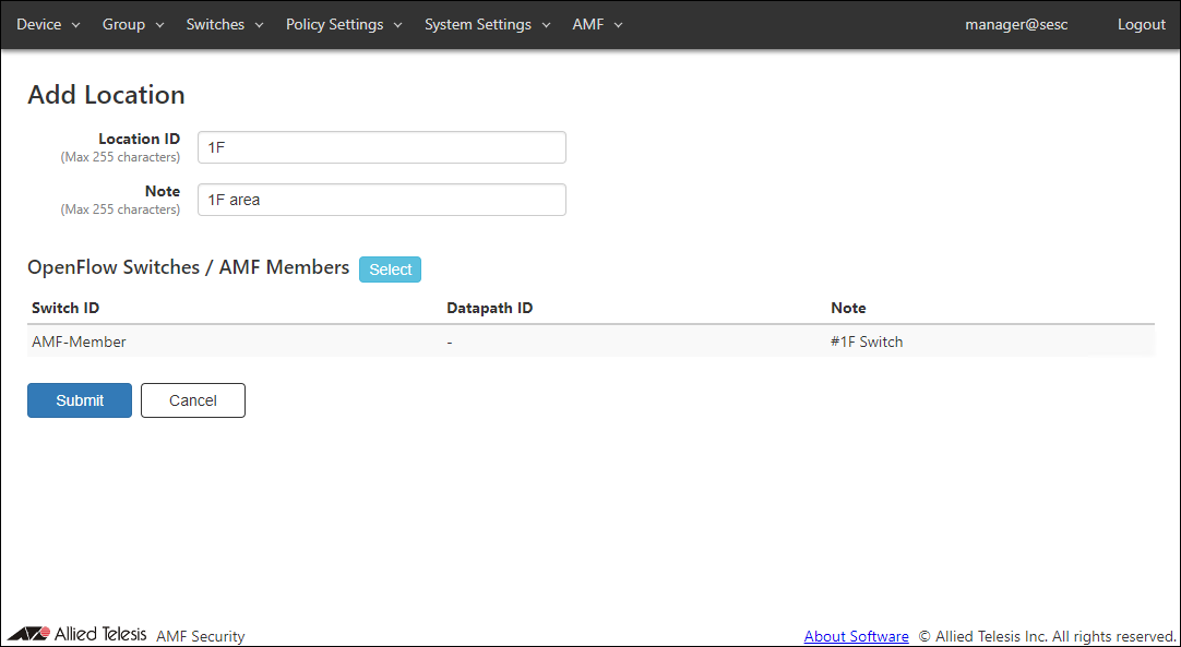 Using locations, you can control the OpenFlow Switches or AMF Members to which a device can connect by location such as an office floor or a meeting room.