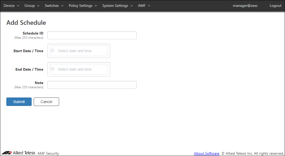 By adding schedules, you can control when a device can connect to the network. If one of the Starting or End Date / Time is not specified in a schedule, AMF Security mini treats it as if it has no time limitation.
