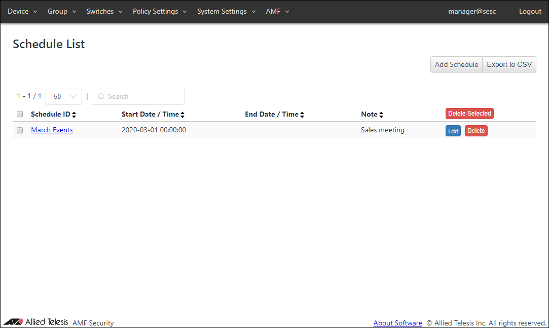 By adding schedules, you can control when a device can connect to the network. If one of the Starting or End Date / Time is not specified in a schedule, AMF Security mini treats it as if it has no time limitation.