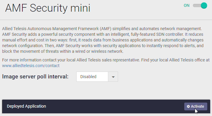 To disable AMF Security mini, stop or delete the application instance, then slide the switch in the upper right corner of the screen to the left.