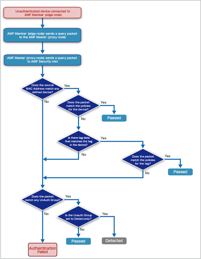 - The AMF member (edge node) checks whether authentication has been performed for the source MAC Address of the packet from the device. If the device has been successfully authenticated, the AMF Member (edge node) forwards the packet according to the corresponding VLAN.