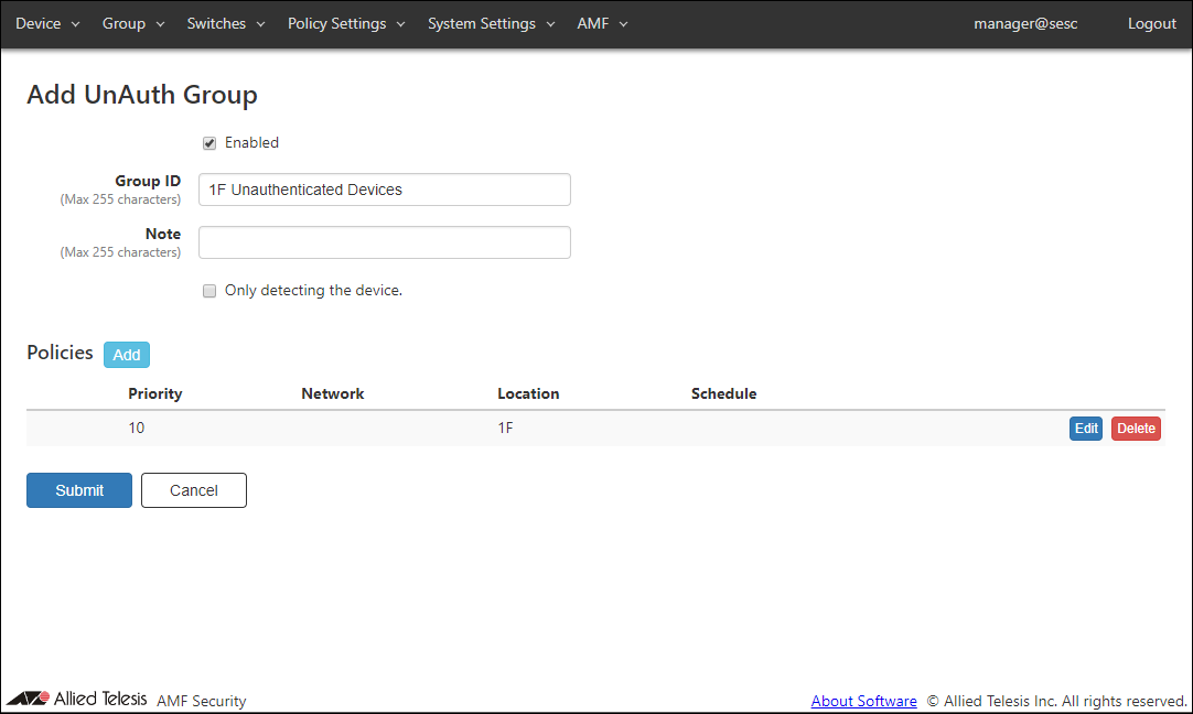 With those settings, unknown devices which are connected to one of the AMF Member in the location "1F" are detected as members of the UnAuth Group "1F Unauthenticated Devices".