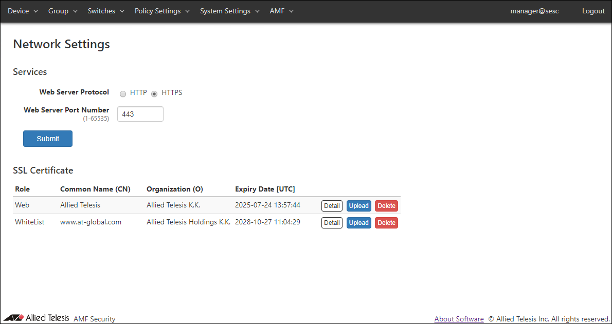 View and change network configurations for the AMF Security mini system.NoteIf you set the upload / delete of the SSL Certificate of the Web server, the connection with the connected AMF Master is temporarily disconnected.