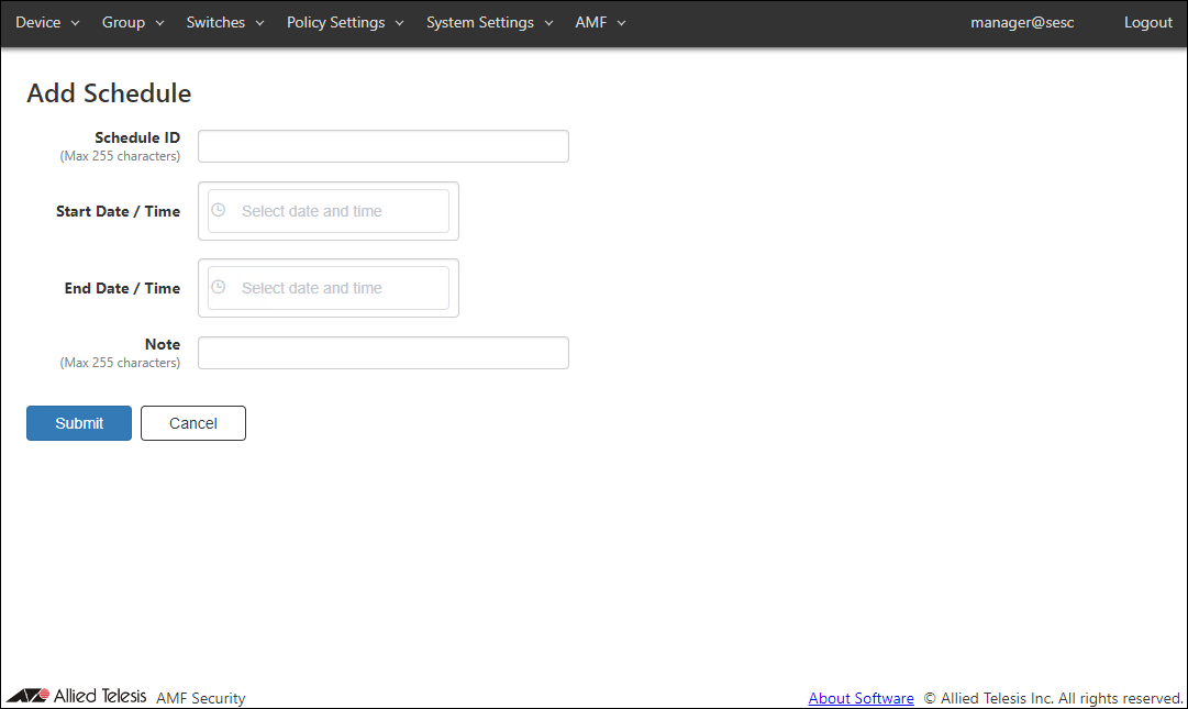 By adding schedules, you can control when a device can connect to the network. If one of the Starting or End Date / Time is not specified in a schedule, AMF Security treats it as if it has no time limitation.