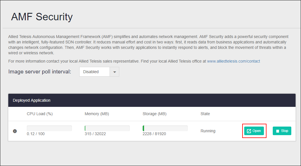 In the initial state of AT-VST-VRT, the application instance of AMF Security is not set. Login to AT-VST-VRT's management web interface and set the application instance of AMF Security.For more information, refer to the AT-VST-VRT document posted on our website.