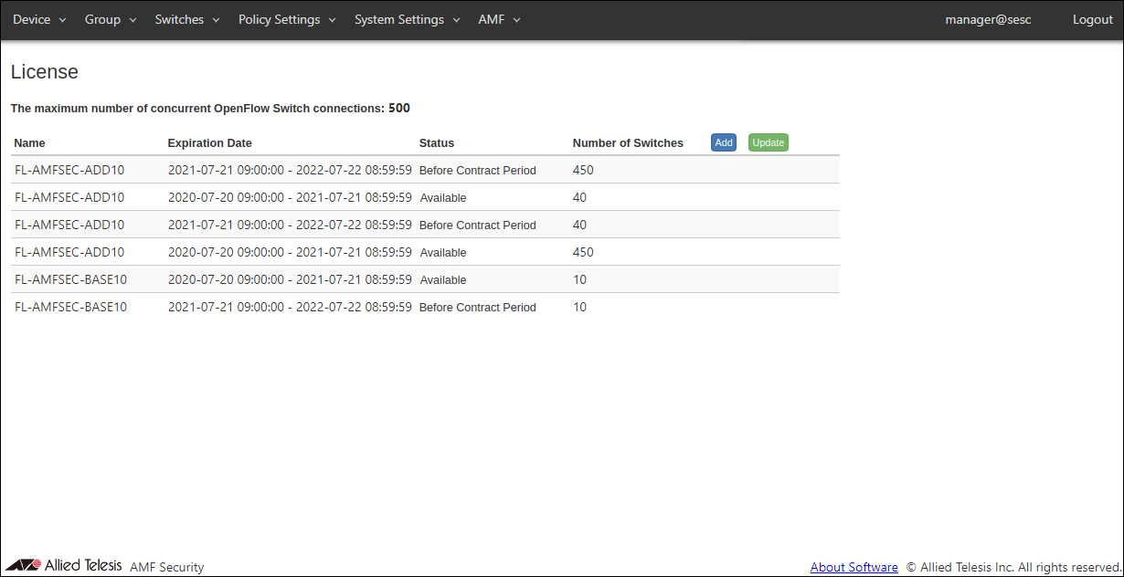 NoteIf the previous license and the renewal license are as follows, the connection between the connected OpenFlow switch and the AMF Master is temporarily disconnected when the license is switched.