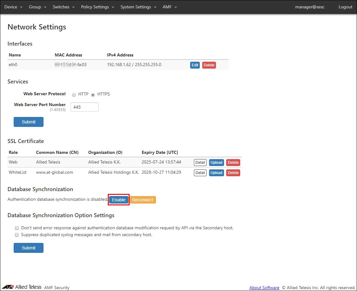 - Display the System Settings > Network Settings page with AMF Security used on the secondary. Click the "Enable" button of the Database Synchronization item.