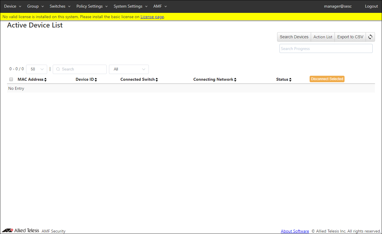 If you have a SSL server certificate issued by a trusted certification authority (CA), you can install the certificate on the Network Settings > System Information page's or the AMF > AMF Application Proxy Settings page's "SSL Certificate" section after logging in to the AMF Security. - After logging in, the Device > Active Device List page is displayed.