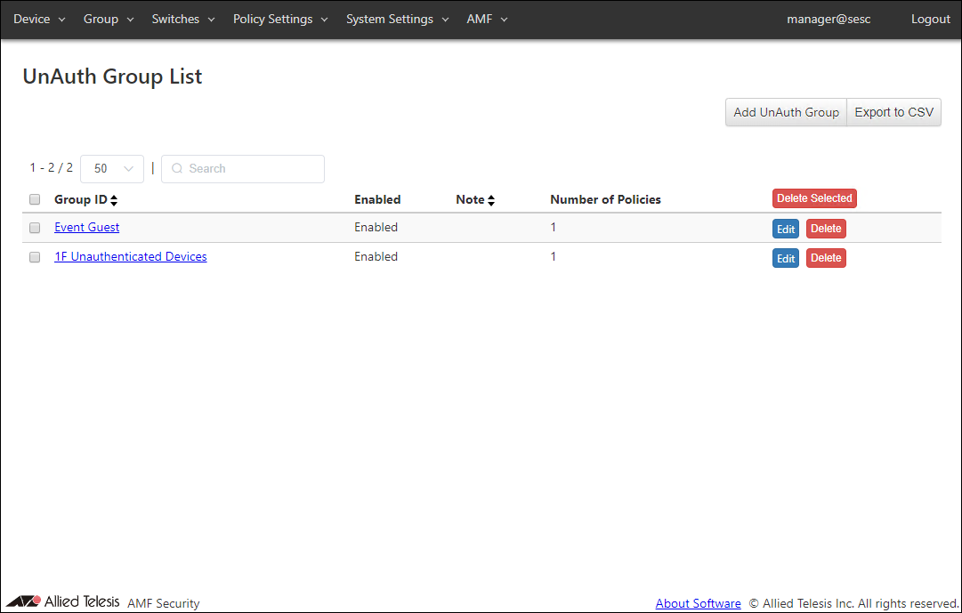 | Export to CSV | Start downloading of a list of the UnAuth Group in CSV format. |