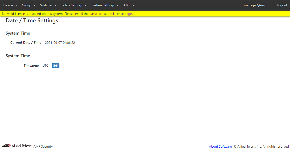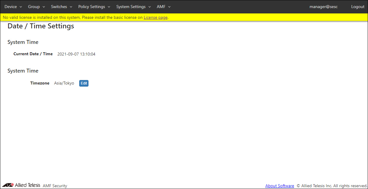 AMF Security gets and uses the system time of AT-VST-VRT, but it does not get the timezone setting. Therefore, for example, to use Japan time (JST: 9 hours ahead of Coordinated Universal Time (UTC)), set according to the following procedure:NoteAMF Security restarts when you change the time zone setting. After that, you need to restart (stop and start) the AMF Security application on the AT-VST-VRT setting page to reflect the timezone setting in the AMF Security Log time.