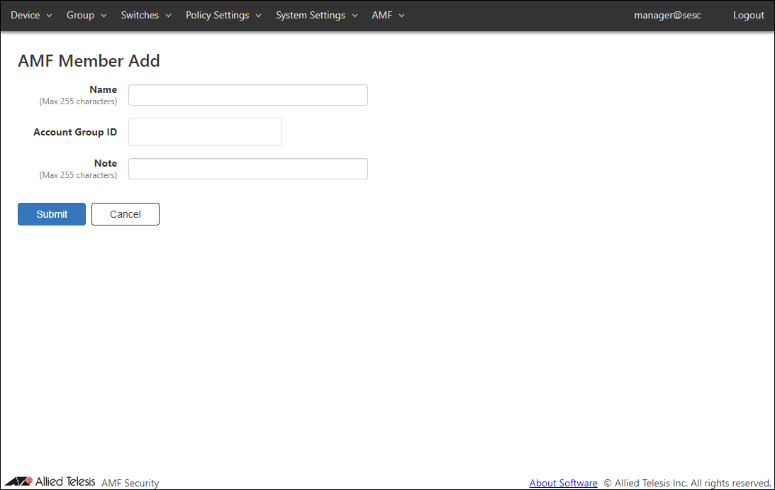 This page lets you register a new AMF Member.By registering as an AMF Member, you can associate security policy locations and account groups.