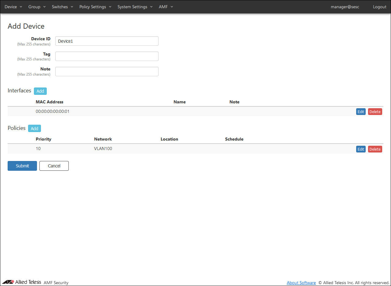 Table 17: Configurable fields Item Name Value Priority 10 Network VLAN100 Location (empty) Schedule (empty) - Click the "Submit" button to return to the Group > Add Tag page.