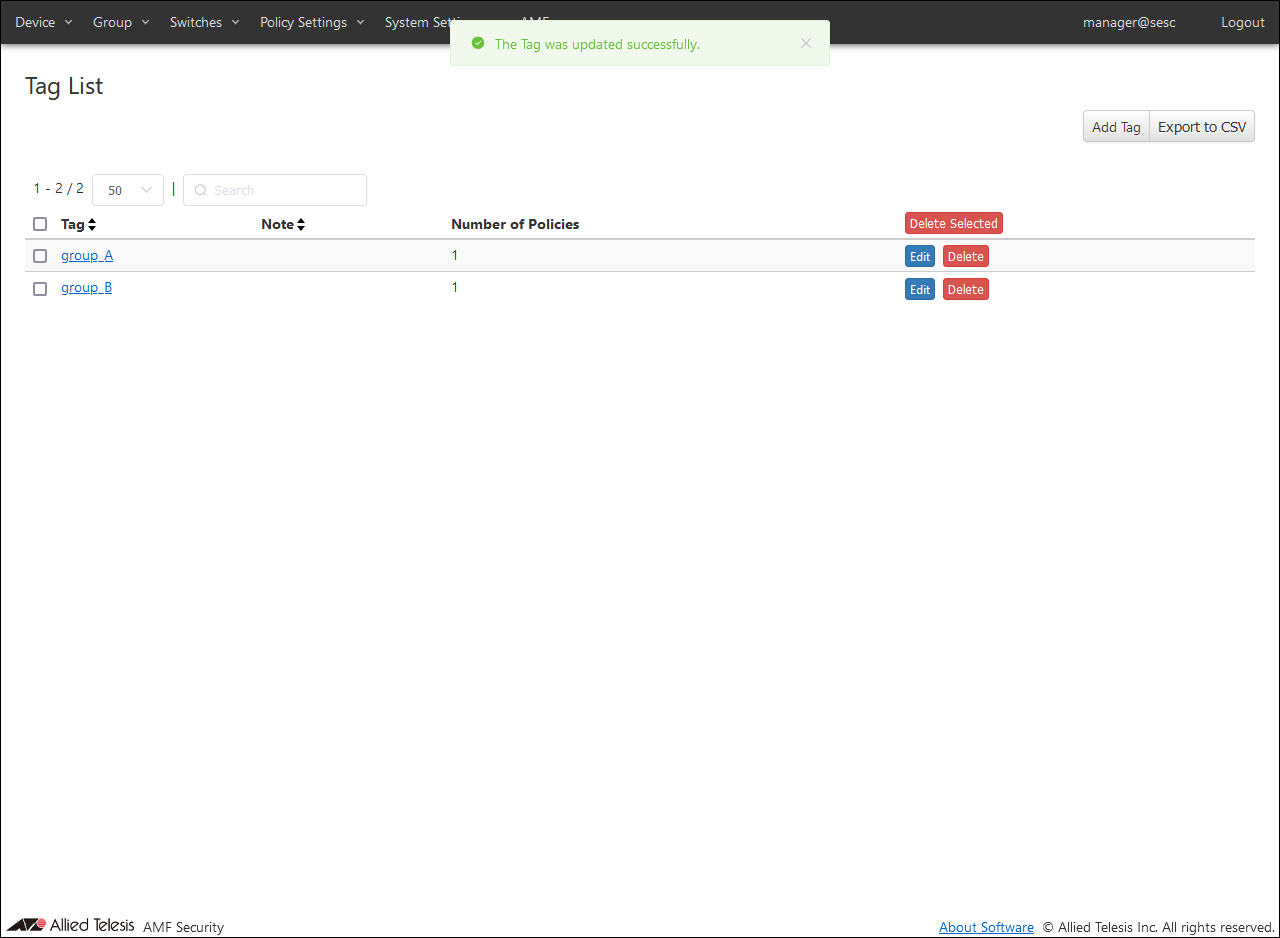 Once the tag is registered, the added information is displayed on the Group > Tag List page.