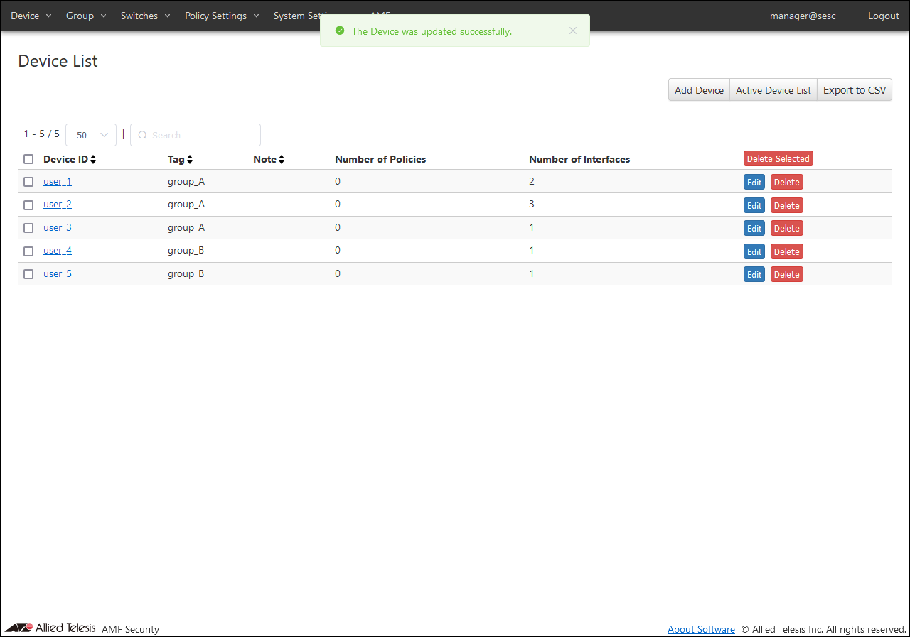 Table 22: Tag configuration data Device ID Tag to register user_2~user_3 group_A user_4~user_5 group_B Table 23: Device ID (Device) configuration data Device ID (user_2) Tag group_A * Common with "user_1 to user_3" Note (empty) Interfaces MAC Address 00:00:00:00:00:03 Name PC-3 Note (empty) Interfaces MAC Address 00:00:00:00:00:04 Name PC-4 Note (empty) Interfaces MAC Address 00:00:00:00:00:05 Name PC-5 Note (empty) Device ID (user_3) Tag group_A * Common with "user_1 to user_3" Note (empty) Interfaces MAC Address 00:00:00:00:00:06 Name PC-6 Note (empty) Device ID (user_4) Tag group_B * Common with "user_4 to user_5" Note (empty) Interfaces MAC Address 00:00:00:00:00:07 Name PC-7 Note (empty) Device ID (user_5) Tag group_B * Common with "user_4 to user_5" Note (empty) Interfaces MAC Address 00:00:00:00:00:08 Name PC-8 Note (empty) - Device > Add Device page (user_2)