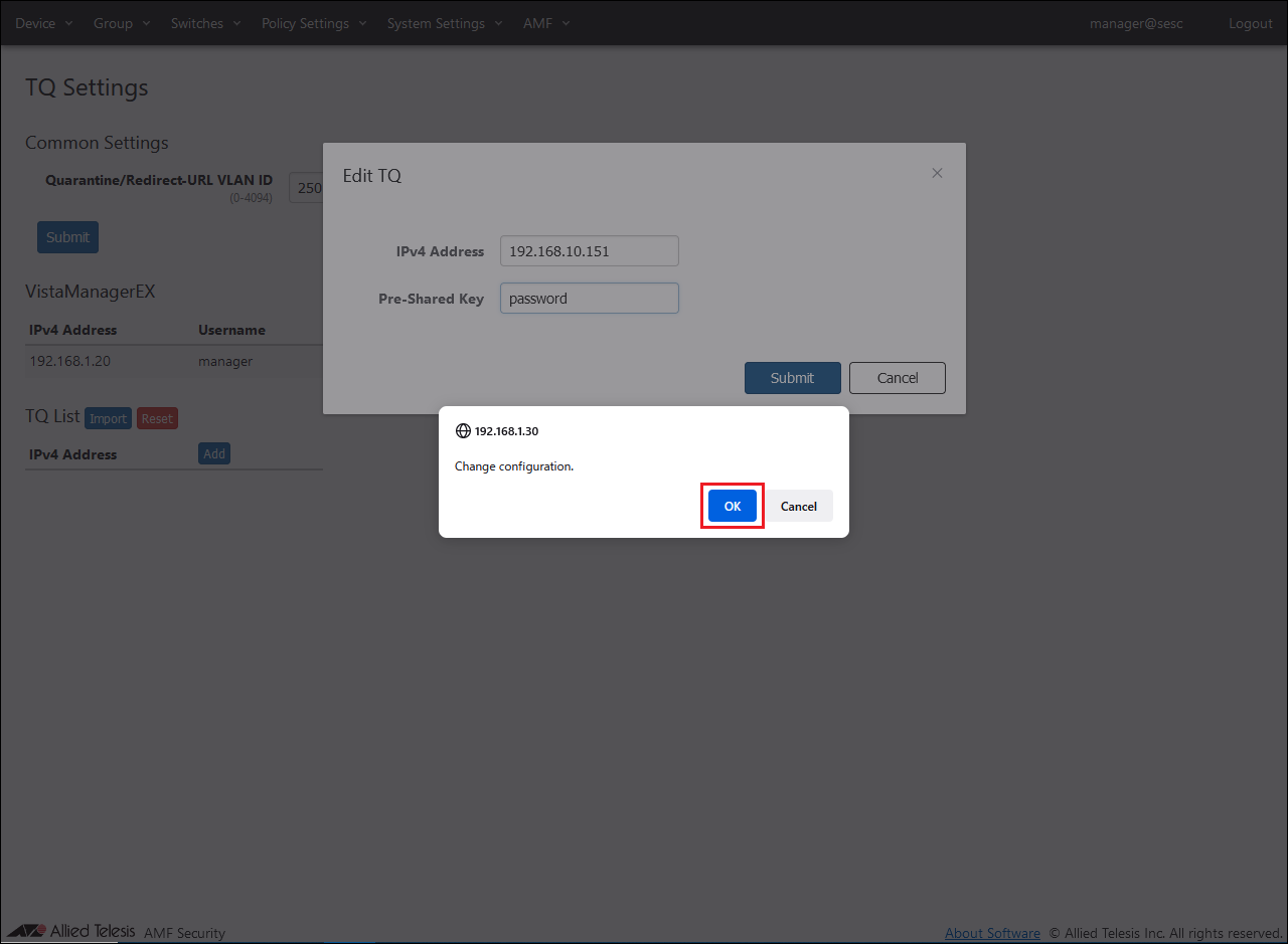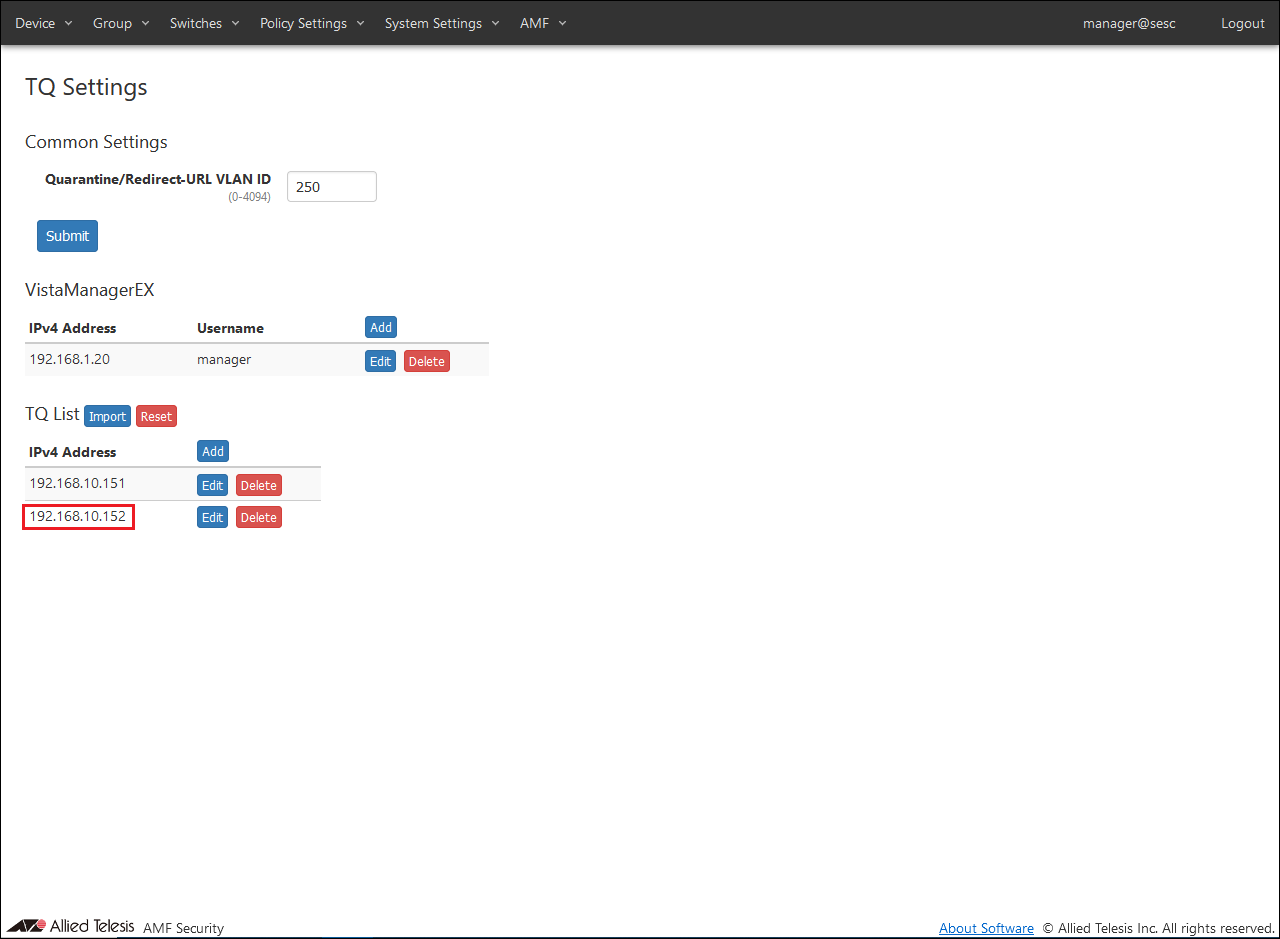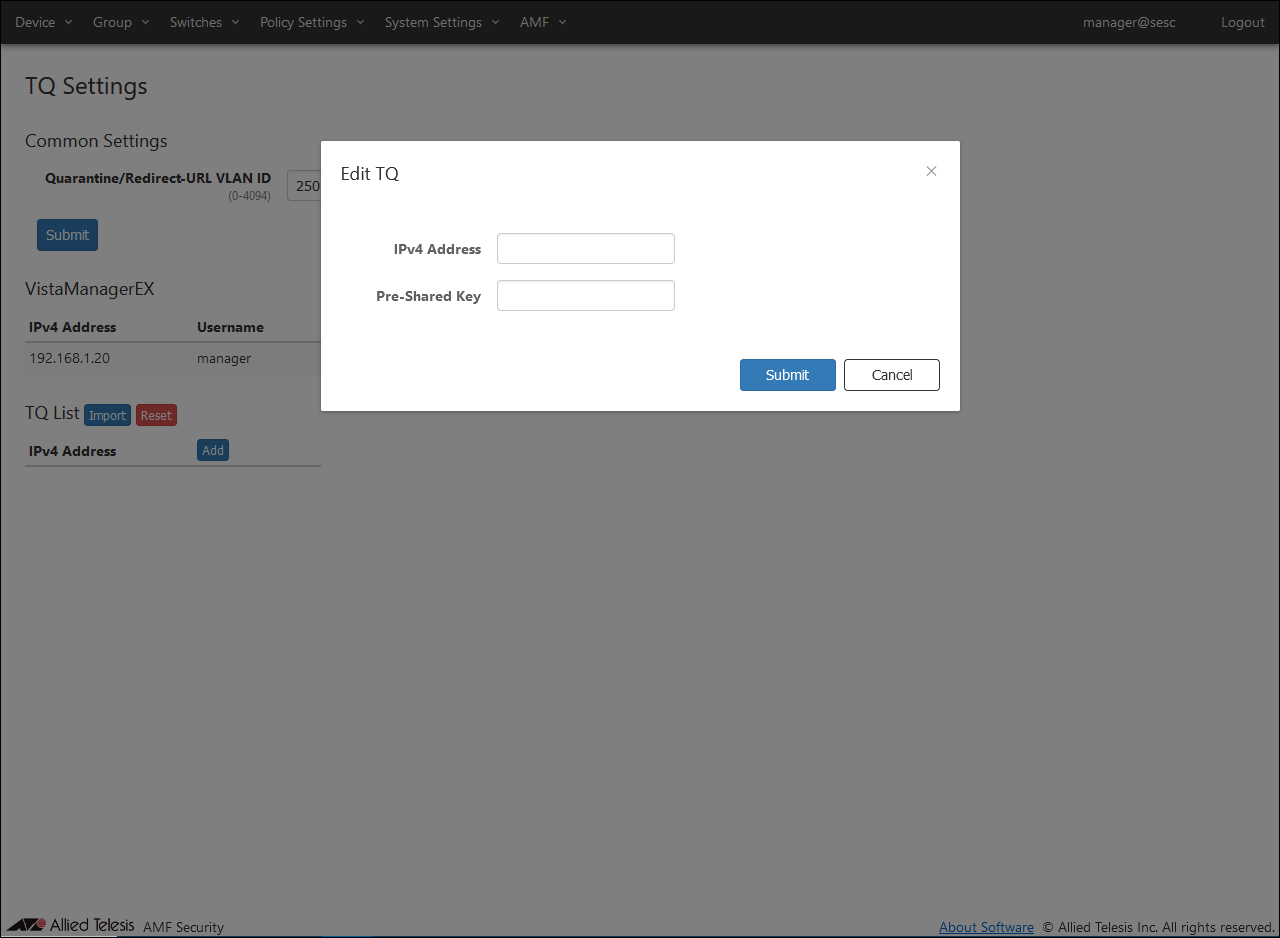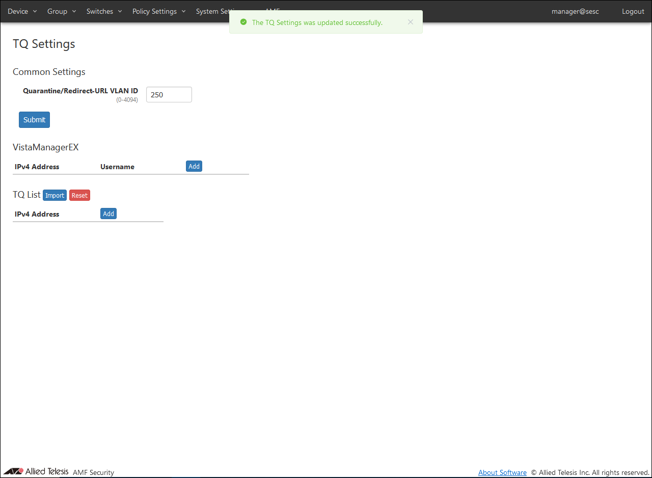 - Open the AMF > TQ Settings page to set the quarantine VLAN ID, Vista Manager EX, and TQ information.