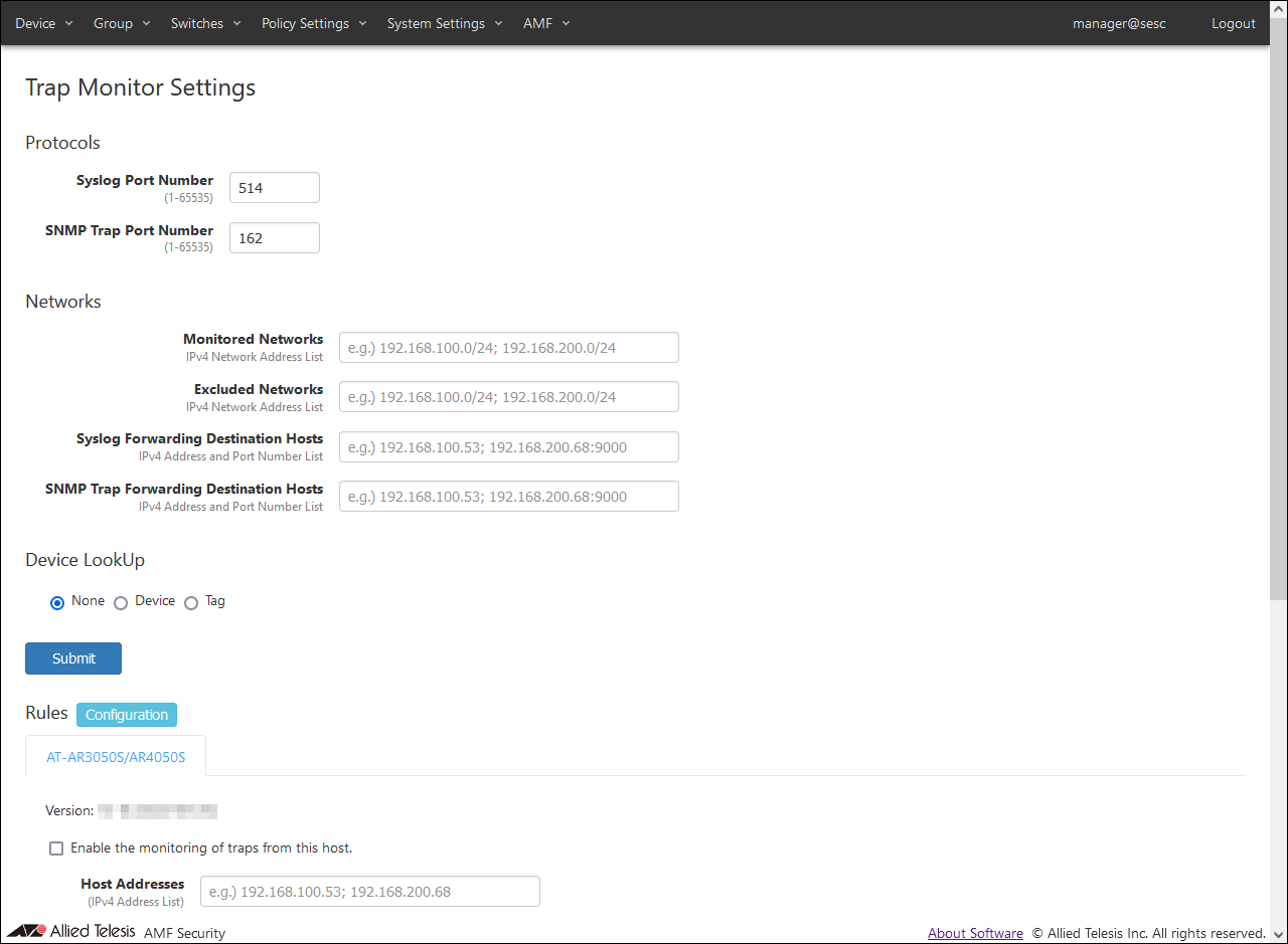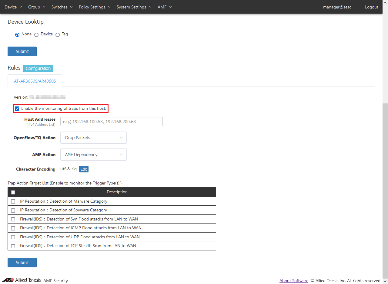 - Display the System Settings > Trap Monitor Settings page and set the rules for the AT-AR3050S/AR4050S's UTM-related functions used as linked applications.