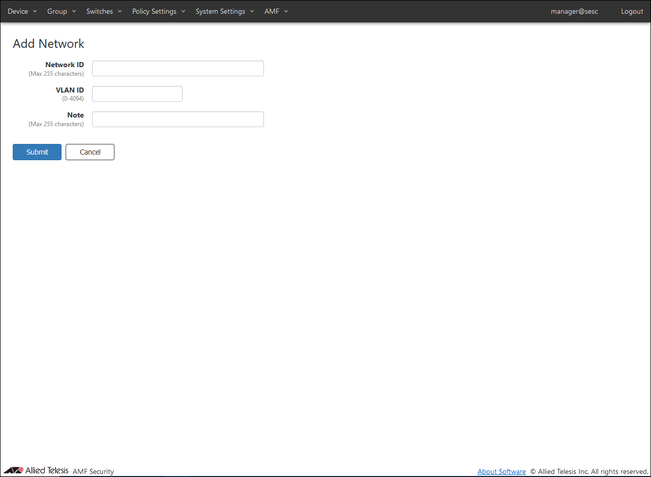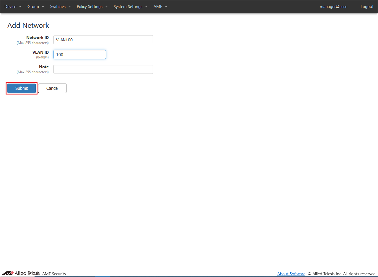 - To register VLAN100, enter Network ID and VLAN ID as follows and click the "Submit" button.