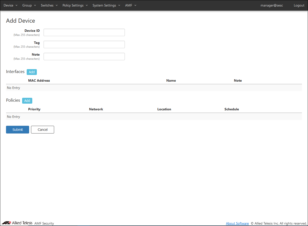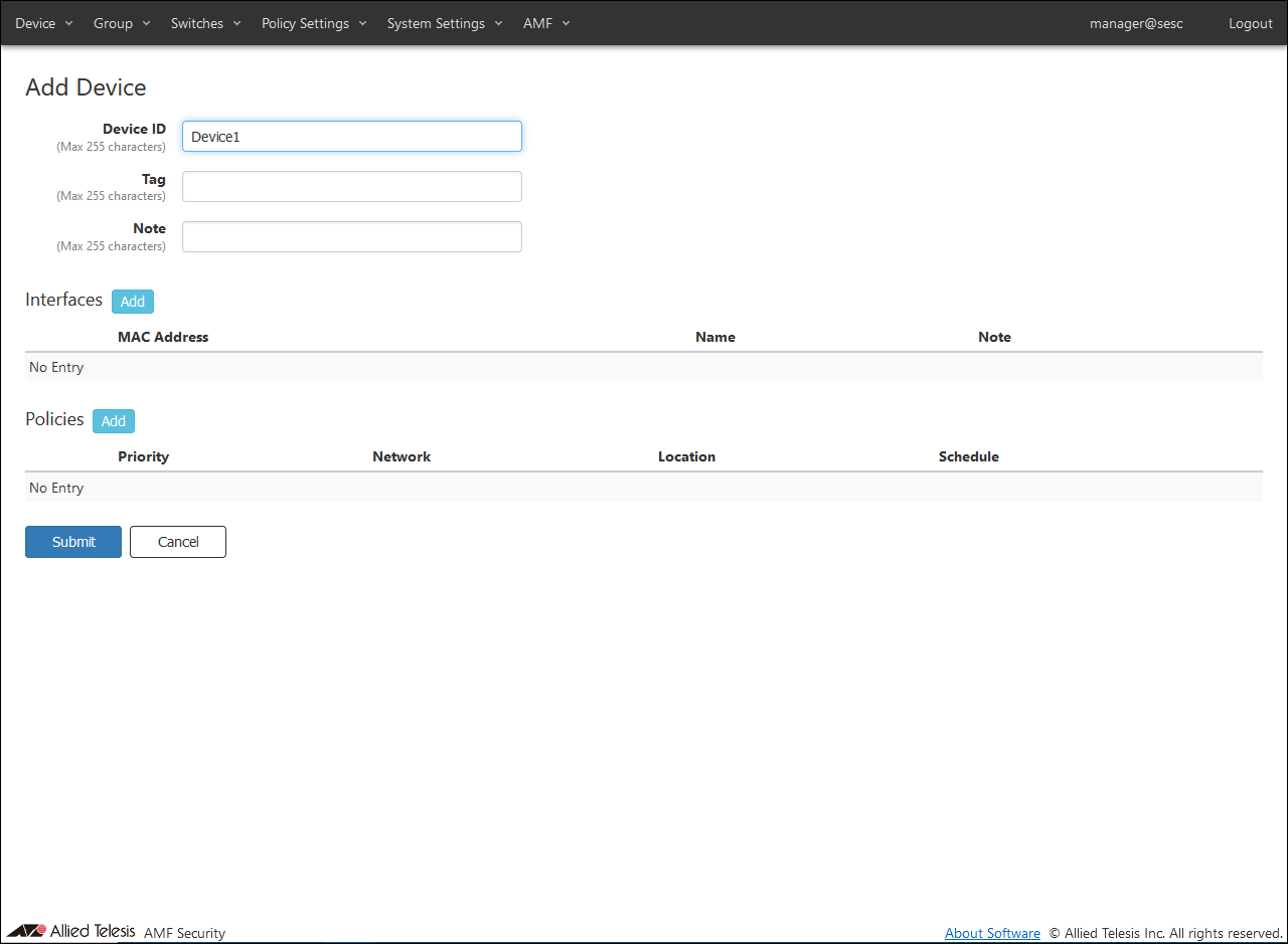 - After entering the Device ID and adding Interfaces and Policies, click the "Submit" button.