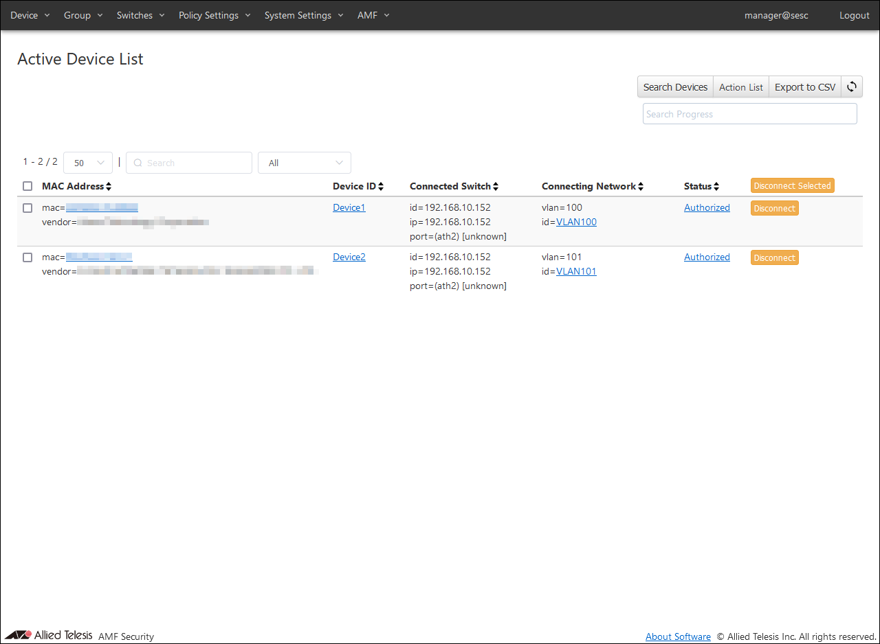 Policy Settings > Action List page. At the same time, AMF Security queries AT-Vista Manager EX for the MAC Address based on the terminal information (IP Address), obtains the MAC Address of the wireless terminal held by the AWC Plug-in, and enables communication control. In the display below, the MAC Address of the wireless terminal is acquired and the IP Address and MAC Address are linked.