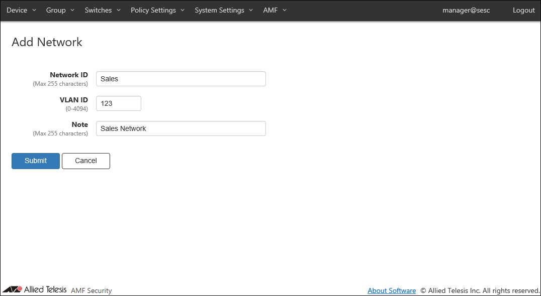 Later you can use the network to specify which VLAN a device can belong to. AMF Security achieves this by telling switches to add appropriate VLAN tags to the packet originating from the allowed devices.