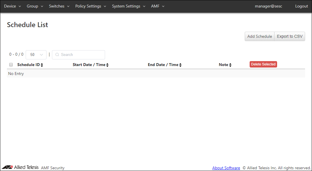 This page lists registered schedules in AMF Security. As you see, there is no schedule at this point.